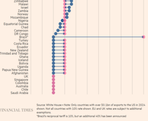 O decreto veio com uma longa lista de isenções para exportações brasileiras que continuarão recebendo a tarifa do “Dia da Libertação” (2.abr) de 10%. Estas incluem, entre outras, equipamentos de transporte aéreo, suco de laranja, móveis, combustível e minério de ferro, enquanto os demais itens – café, carnes, frutas etc. – terão os 50% a partir de 6 de agosto. Algo abaixo de 40% das exportações brasileiras permaneceu sem os 40% de tarifa adicional.