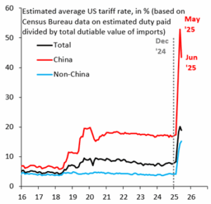 The impact of the higher tariffs is clear in US-China trade. According to calculations by Robin J. Brooks, the effective US tariff on China is currently 44%, well above the 17% in December 2024. Meanwhile, the effective tariff on the rest of the world, according to Brooks, was 15% in June, compared to 4% in December 2024 (Figure 2).